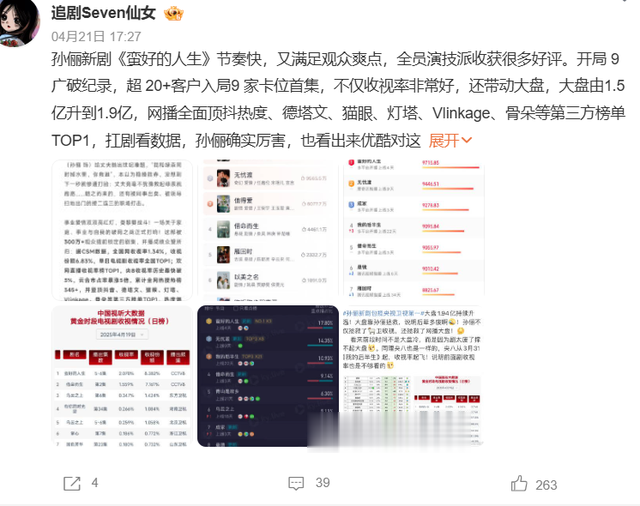 近段时间,孙俪新剧《蛮好的人生》节节开花,无论热度还是收视率都霸榜,还直接带动了大盘。